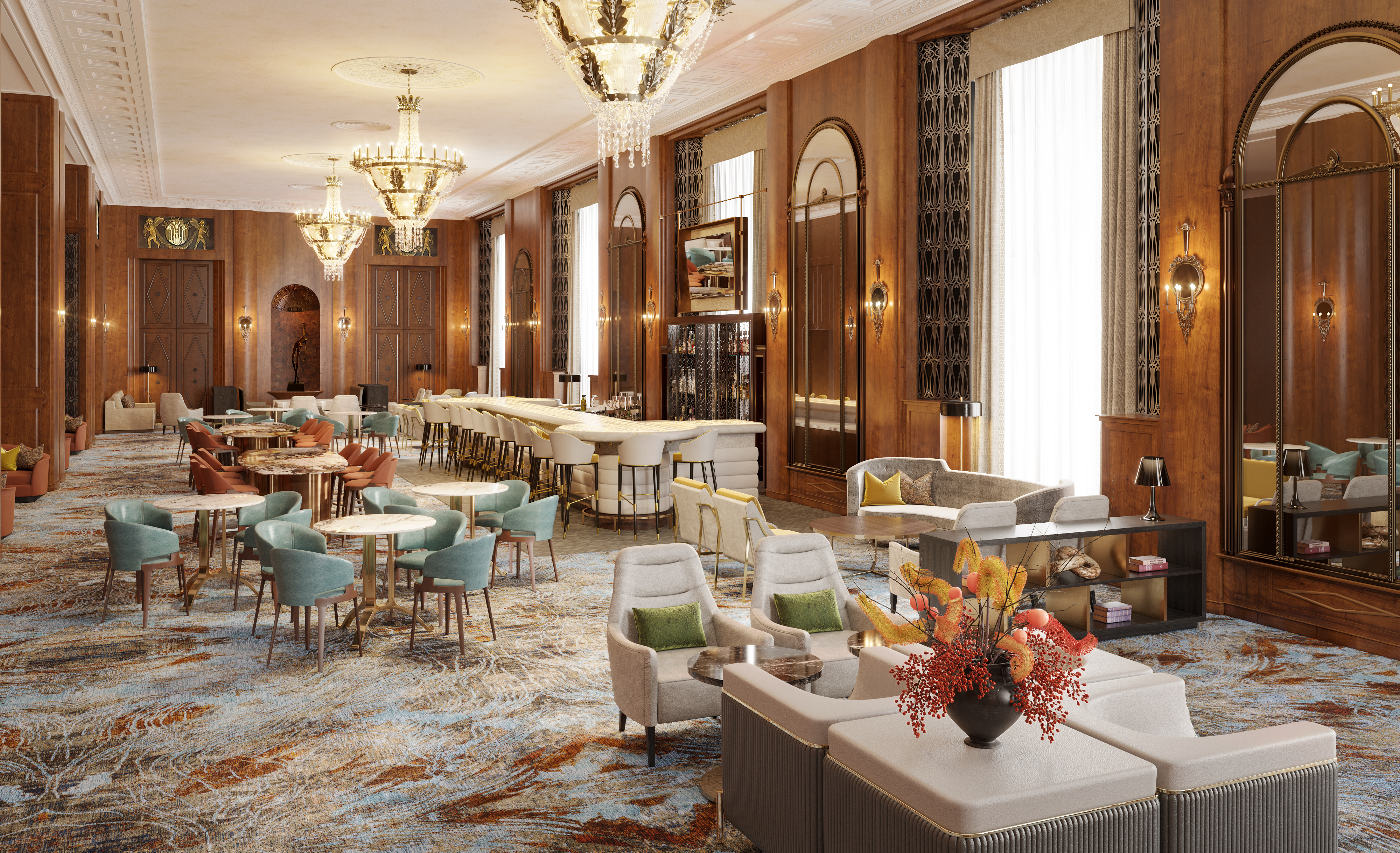 The timeless design extends into the corridors with new wallcoverings and light woodwork throughout. Custom carpeting featuring an organic design with shades of gold and blue will flow through the hallways transitioning to a structured pattern near the elevator lobbies, with art deco fixtures lighting the corridors.